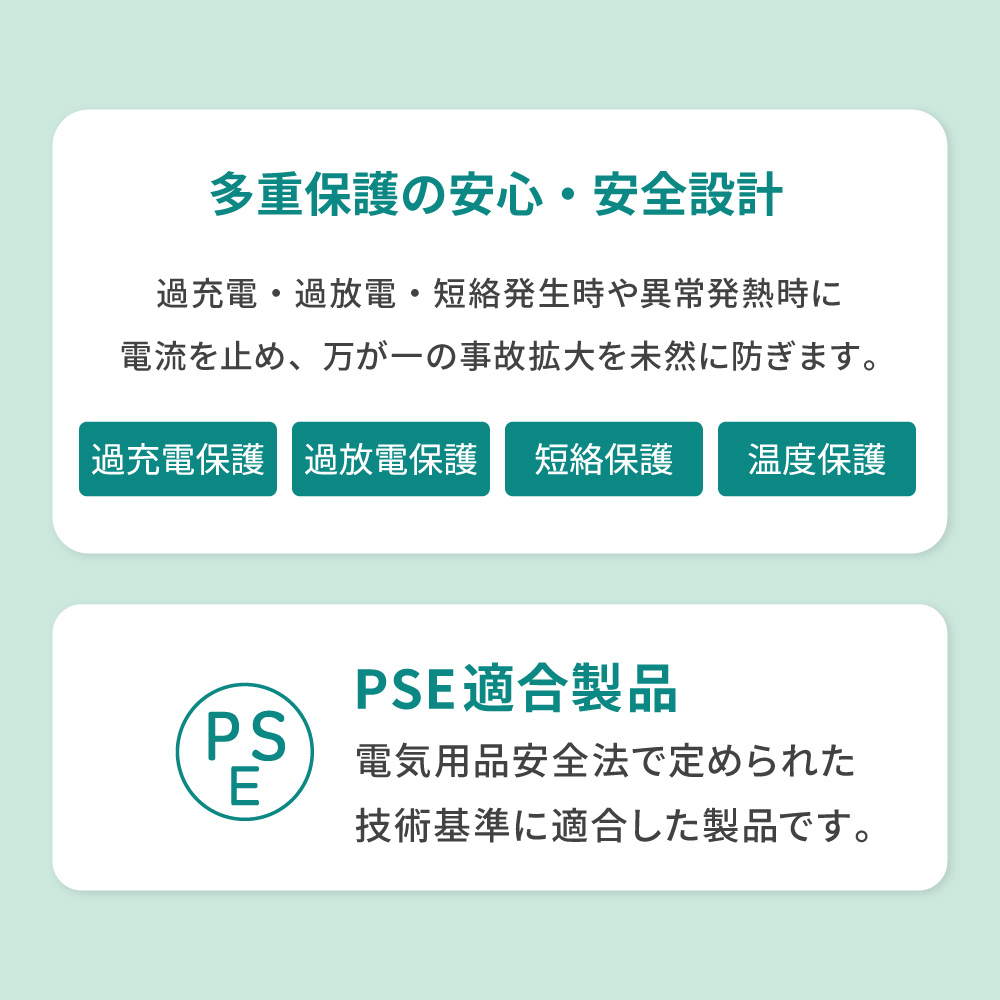 保護機能の「過充電(電圧/電流)保護」「過放電(電圧/電流)保護」「短絡(ショート)保護」「温度保護」を搭載し、高い安全性を備えております。バッテリーの劣化を抑えながら、ショート時の過電流を止め、高温になると充電がストップすることで、万が一の事故を未然に防ぎます。