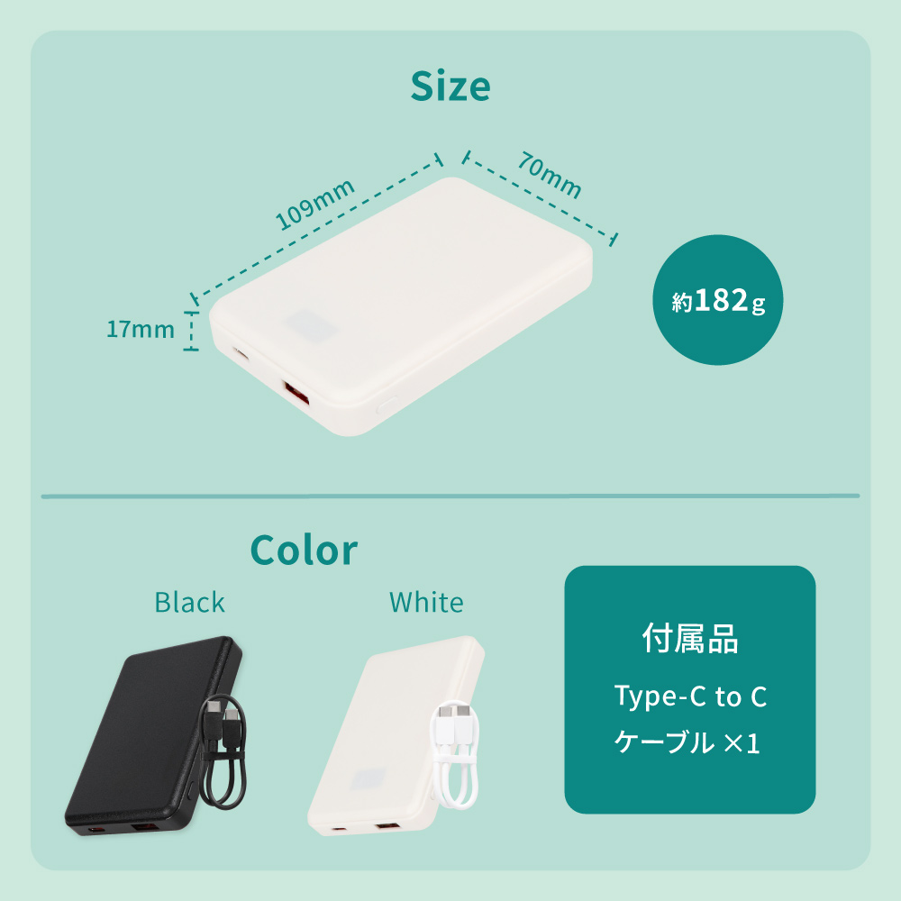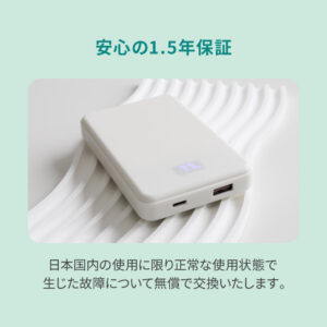 安全性に優れる「準固体電池」を採用した、容量10000mAhのモバイルバッテリーです。iPhone 17であれば、約1.8回充電できる実用的な容量で、外出や旅行、出張などでも安心してお使いいただけます。