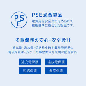 日本の法律である「電気用品安全法」で定められた検査を実施したPSE適合製品です。安心・安全にご利用いただけます。