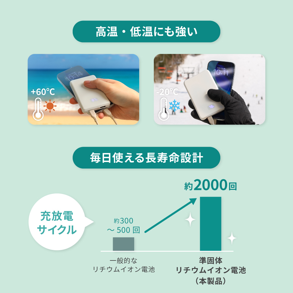 電池の電解質にゲル状素材を採用し、従来のモバイルバッテリーに比べて発火リスクを低減。劣化しにくい構造の為約2000回の充放電サイクルに対応しており、毎日の使用でも長く使える設計です。また-20℃~60℃の高温や低温にも強いい特長があります。