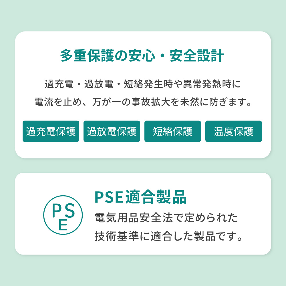 保護機能の「過充電(電圧/電流)保護」「過放電(電圧/電流)保護」「短絡(ショート)保護」「温度保護」を搭載し、高い安全性を備えております。バッテリーの劣化を抑えながら、ショート時の過電流を止め、高温になると充電がストップすることで、万が一の事故を未然に防ぎます。