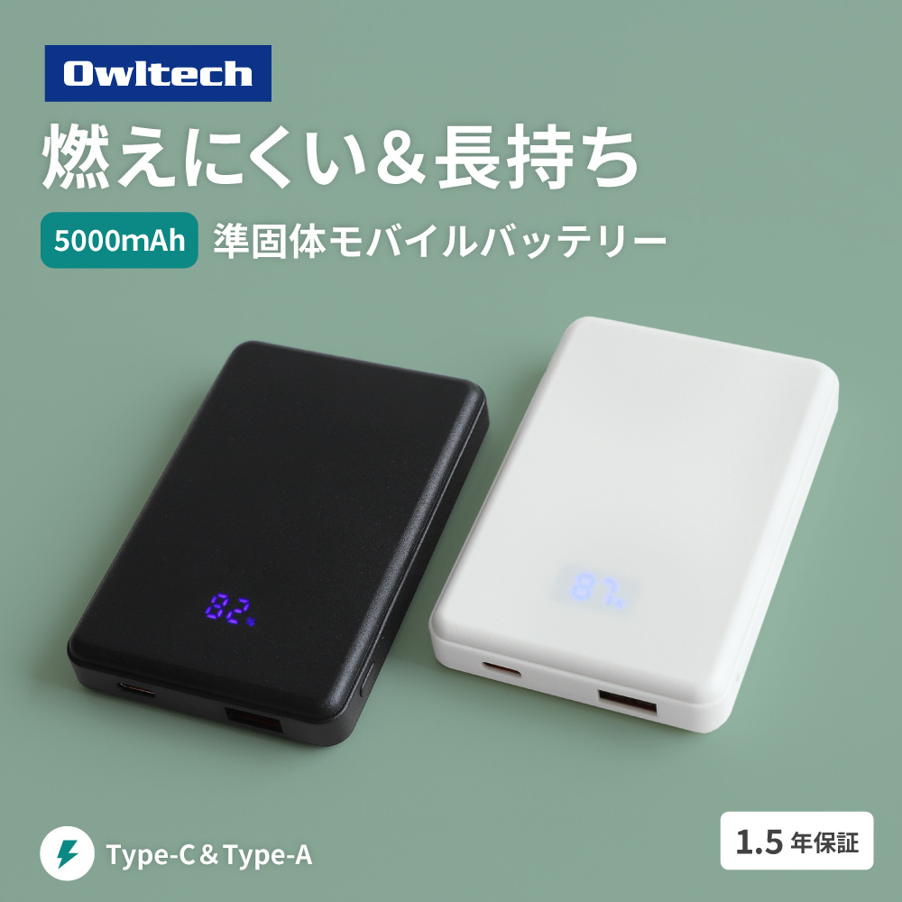 安全性に優れる「準固体電池」を採用した、容量5000mAhのモバイルバッテリーです。コンパクトながら、日常使いのスマートフォン充電に十分な容量を備え、安心して長く使えます。