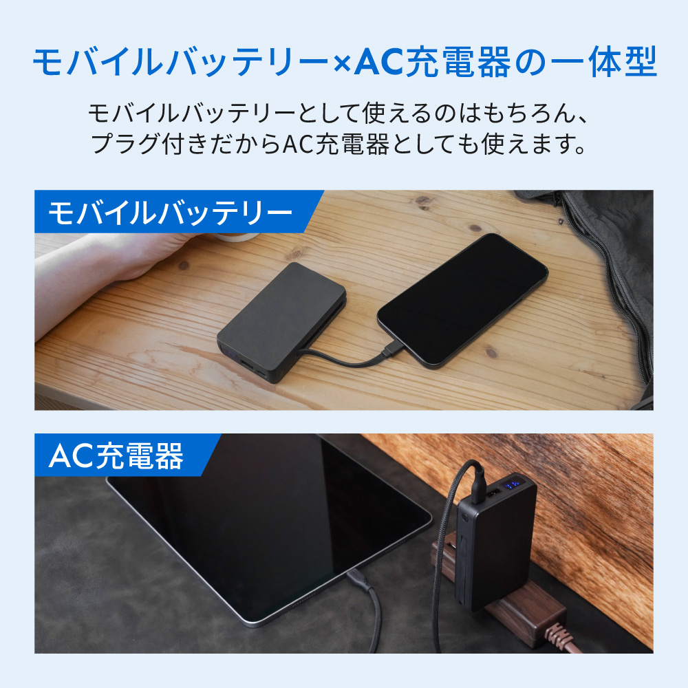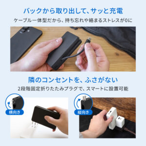 本体に備えたAC一体型ケーブルに加え、USB Type-CポートとUSB Type-Aポートを搭載。外出先でも家でも、これ1台で最大3台のデバイスを同時に充電できます。