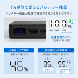 AC充電器として使用する際はUSBType-Cポートが最大45W出力するので、ノートPCの充電にも利用できます。モバイルバッテリーの場合も最大20W出力するのでスマートフォンやタブレットを効率よく充電できます。