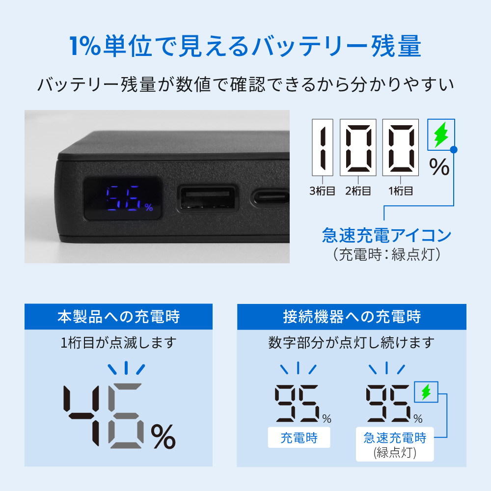 LEDランプ数の残量表示よりもわかりやすく充電残量を確認できます。