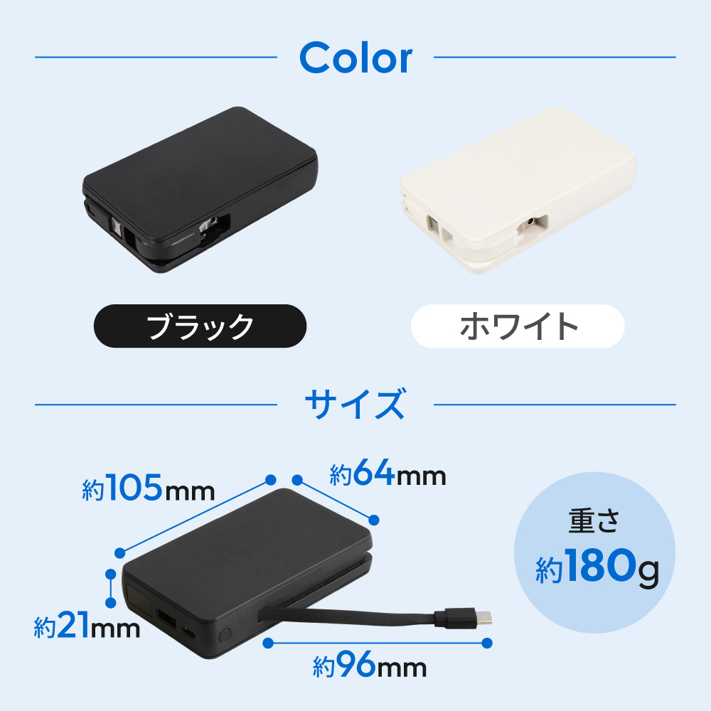 安全性に優れた準固体電池を採用した一体型モバイルバッテリー。AC充電器とモバイルバッテリーが一体となり、Type-Cケーブルも内蔵され持ち運びやすい。5000mAhのコンパクトなサイズで通勤や外出先でも重宝します。
