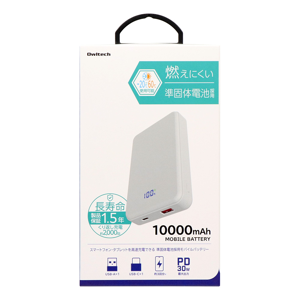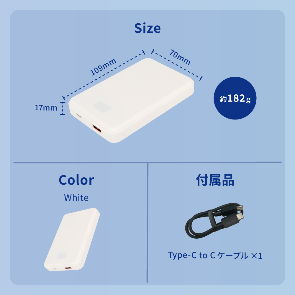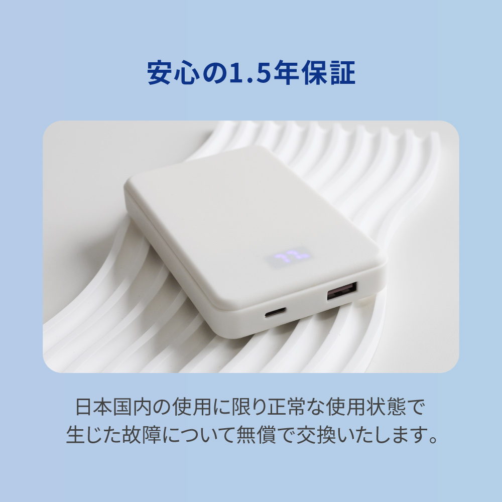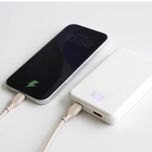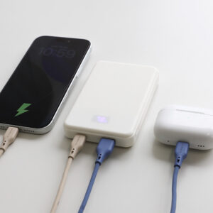 安全性に優れる「準固体電池」を採用した、容量10000mAhのモバイルバッテリーです。iPhone 17であれば、約1.8回充電できる実用的な容量で、外出や旅行、出張などでも安心してお使いいただけます。