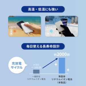 約2000回の充放電サイクルに対応し、毎日の使用でも長く使える設計です。また、-20℃~60℃の高温・低温にも強い特長があります。