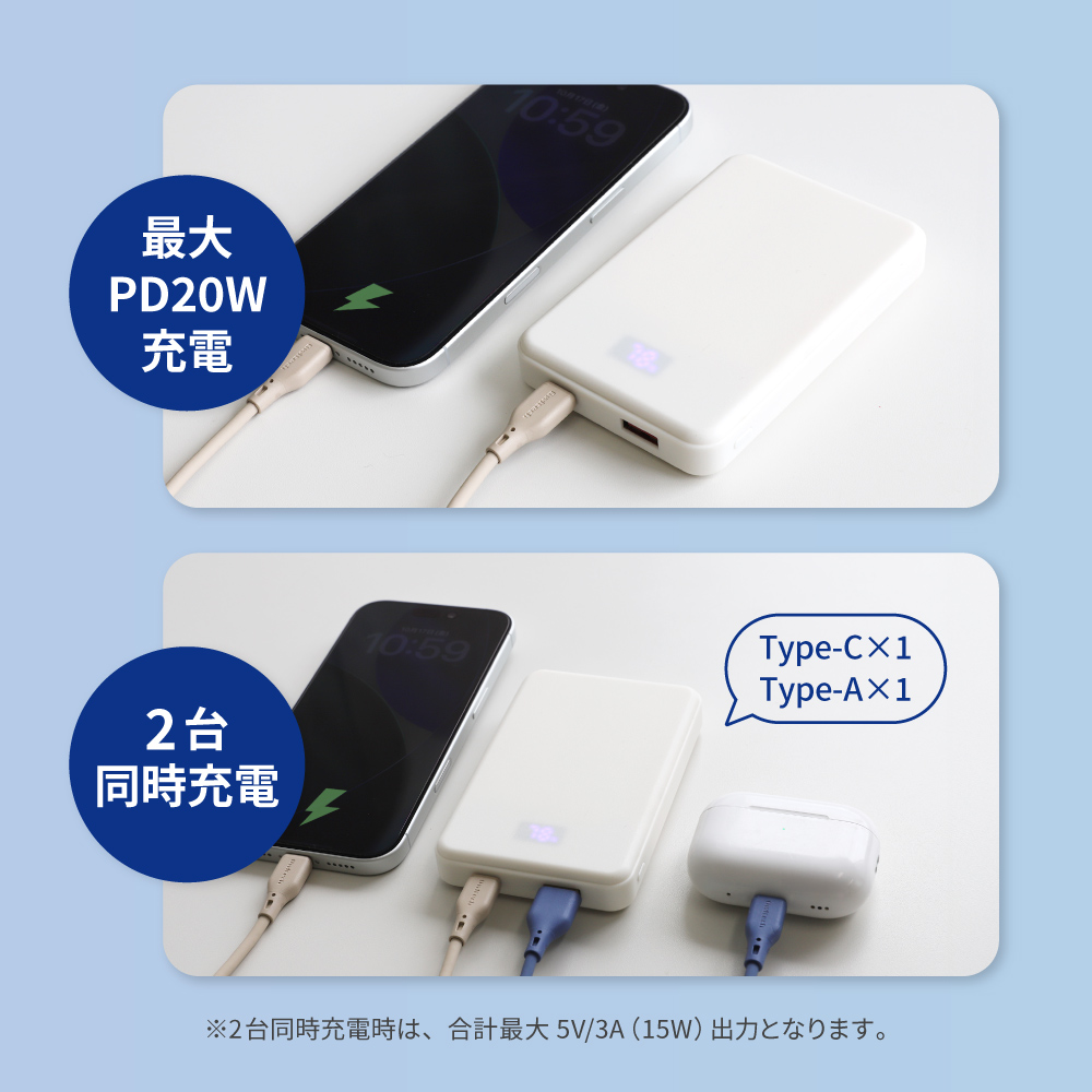 USB Type-CポートとUSB Type-Aポートを搭載し、合計最大5V/3A出力で2台の機器を同時に充電できます。スマートフォンとワイヤレスイヤホンなど、2つのデバイスを一度に充電できる便利な仕様です。