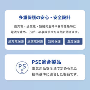 日本の法律である「電気用品安全法」で定められた検査を実施したPSE適合製品です。安心・安全にご利用いただけます。