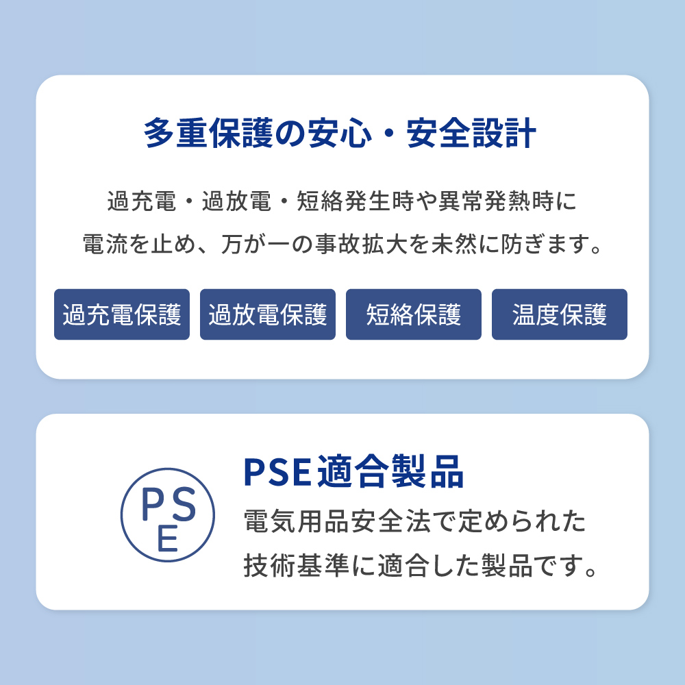 保護機能の「過充電(電圧/電流)保護」「過放電(電圧/電流)保護」「短絡(ショート)保護」「温度保護」を搭載し、高い安全性を備えております。バッテリーの劣化を抑えながら、ショート時の過電流を止め、高温になると充電がストップすることで、万が一の事故を未然に防ぎます。