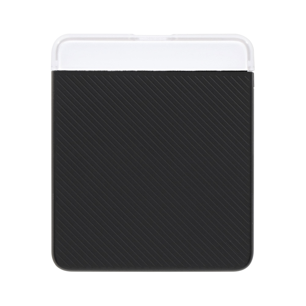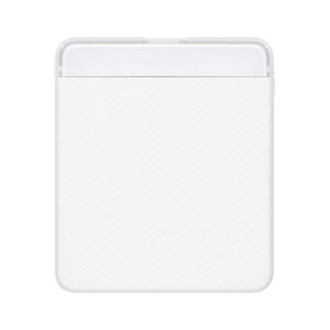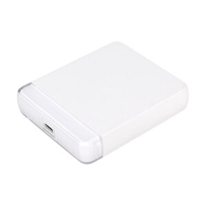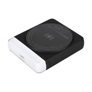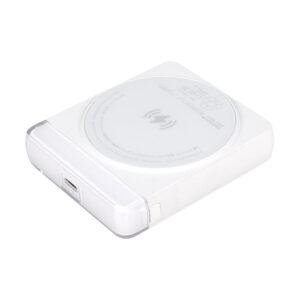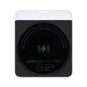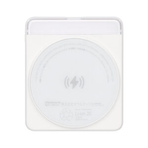 本製品は手のひらサイズのワイヤレス充電対応モバイルバッテリーです。しっとりした手触りの素材とつるっとした素材が組み合わさったスタイリッシュなデザインが特長です。