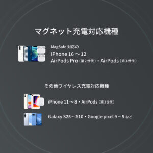 MagSafe対応のiPhoneシリーズ(iPhone12以降)、MagSafe対応のAirPodsシリーズ、その他ワイヤレス充電対応機器など