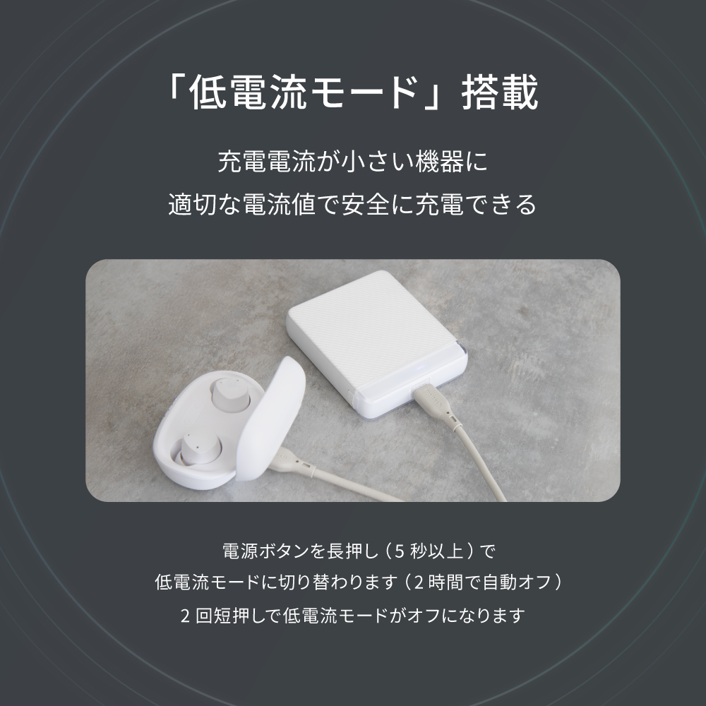 『低電流モード』ではワイヤレスイヤホンやウェアラブル機器などの充電電流が小さい機器に、適切な電流値で安全に充電ができます。