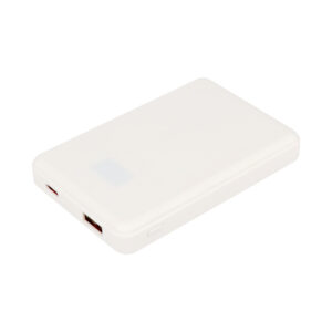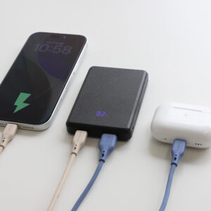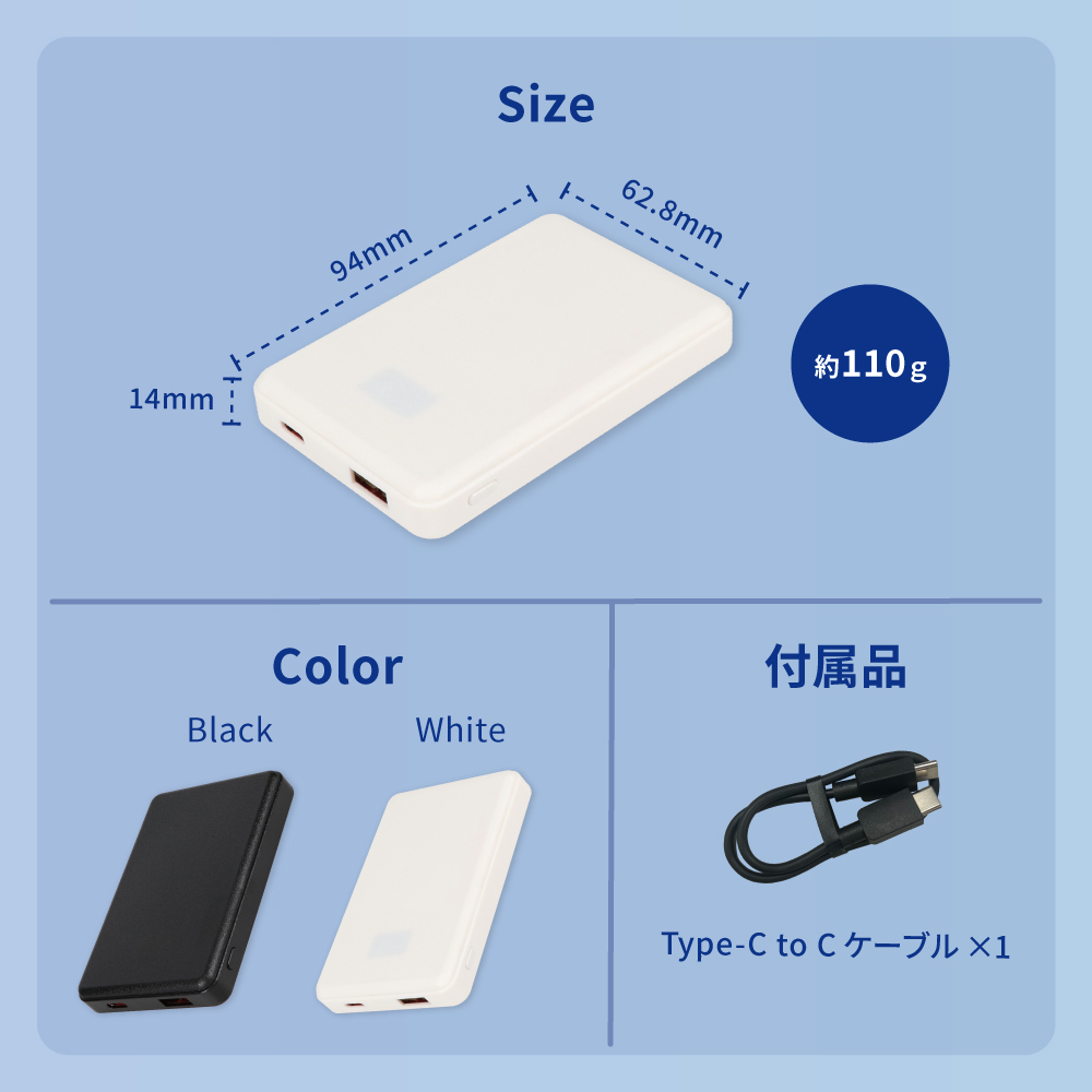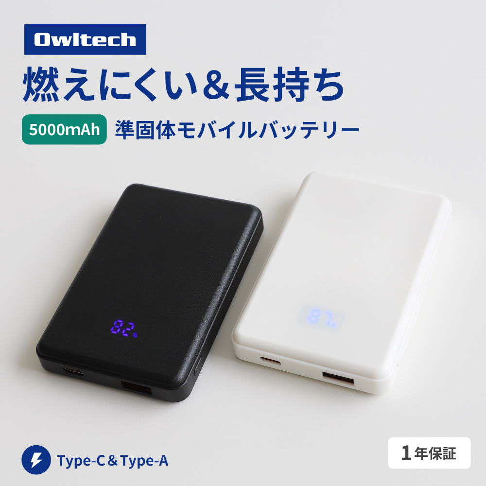 安全性に優れる「準固体電池」を採用した、容量5000mAhのモバイルバッテリーです。コンパクトながら、日常使いのスマートフォン充電に十分な容量を備え、安心して長く使えます。