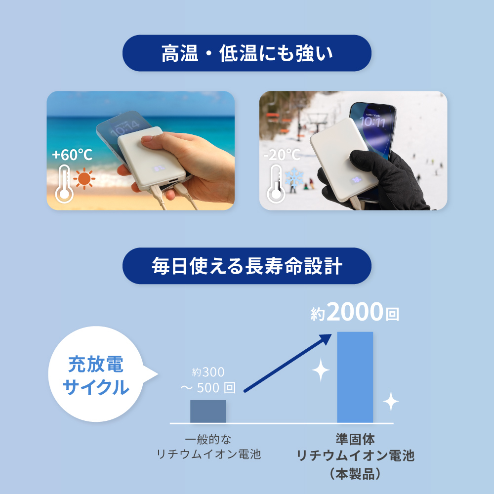 約2000回の充放電サイクルに対応し、毎日の使用でも長く使える設計です。また、-20℃~60℃の高温・低温にも強い特長があります。