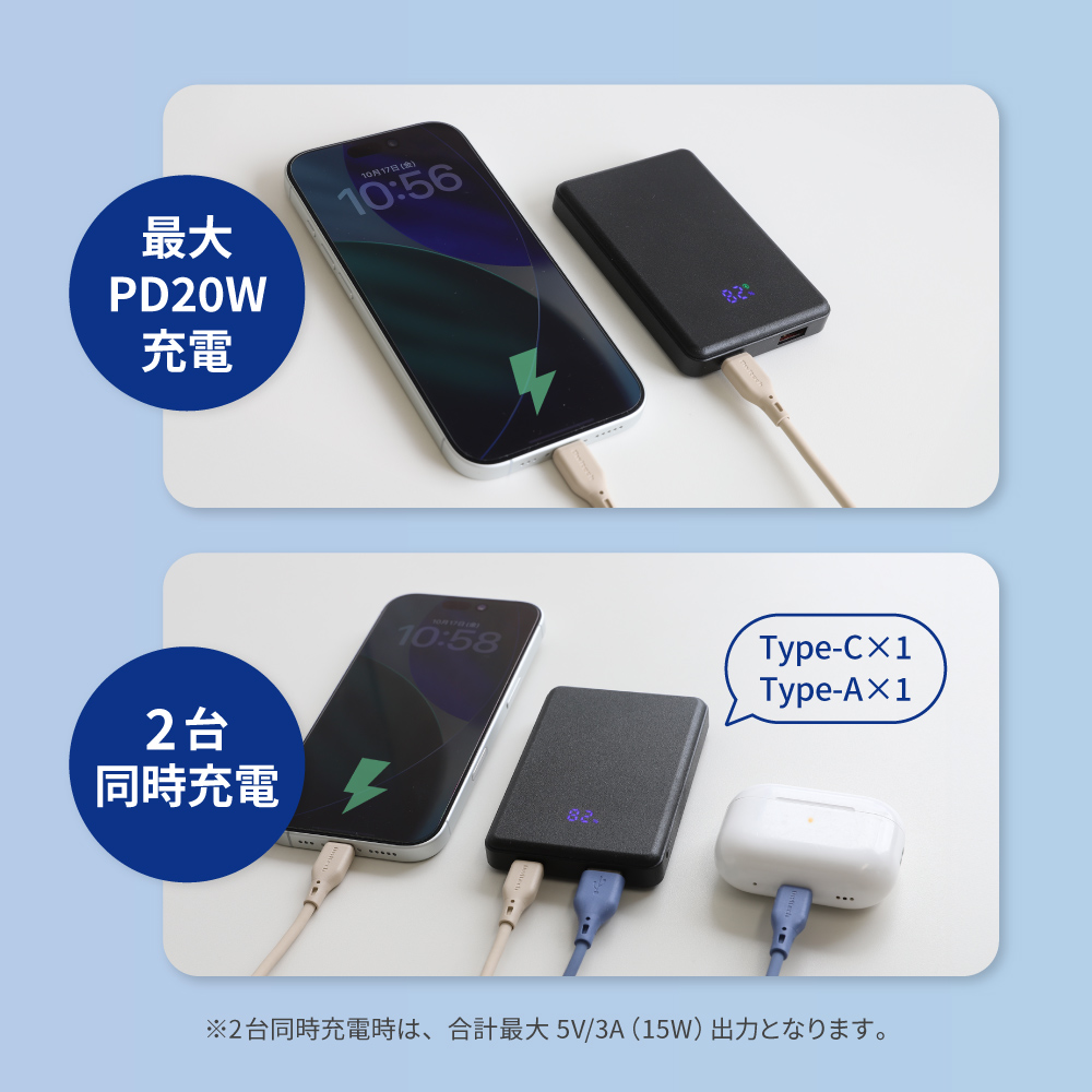 USB Type-CポートとUSB Type-Aポートを搭載し、合計最大5V/3A出力で2台の機器を同時に充電できます。スマートフォンとワイヤレスイヤホンなど、2つのデバイスを一度に充電できる便利な仕様です。