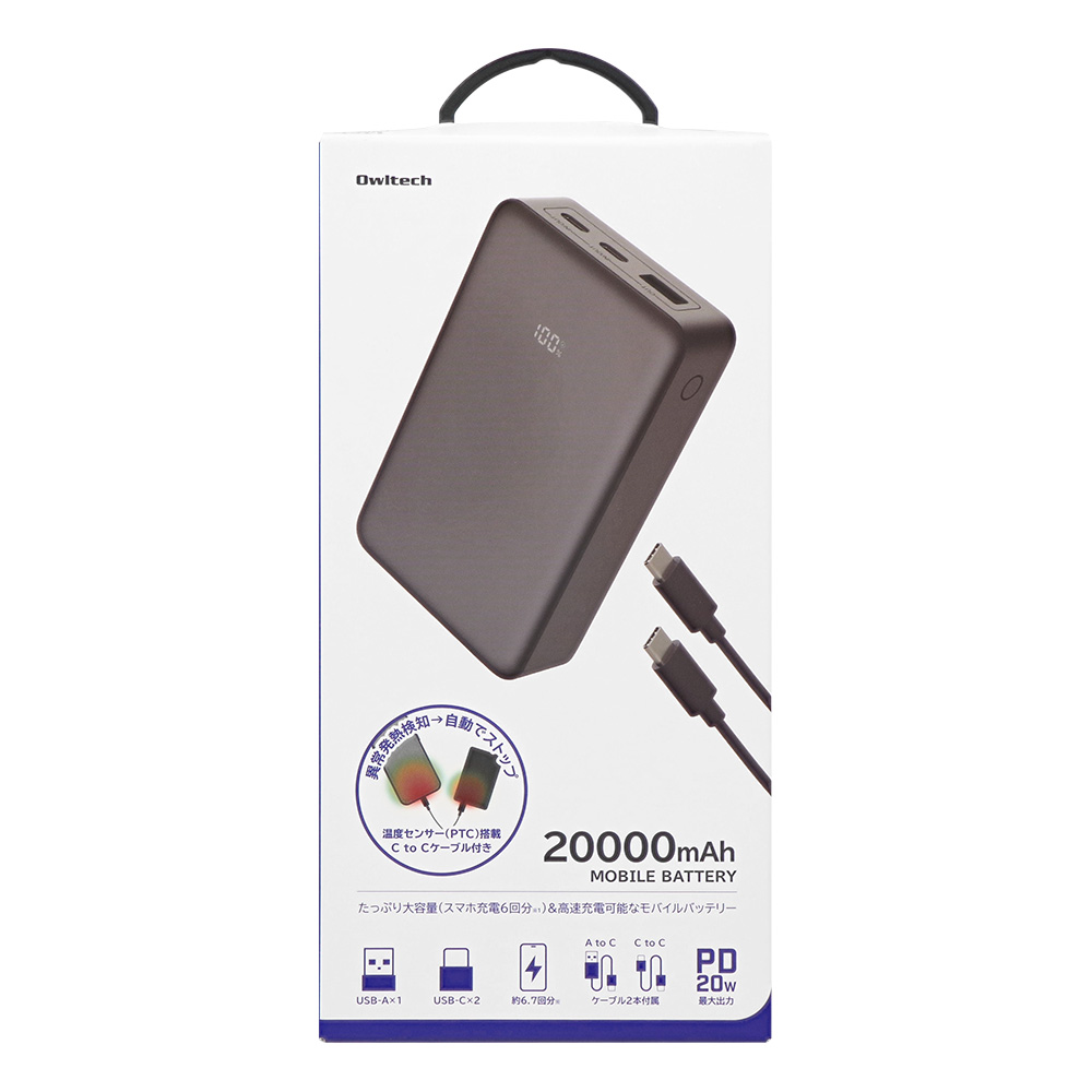 【販路限定】USBケーブル2本付属 20000mAh 最大PD20W出力対応 USB Type-C入出力/USB Type-A出力 モバイルバッテリー OWZ-LPB20028-BKZ