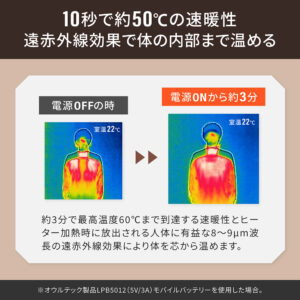 約3分で最高温度60℃まで到達する速暖性とヒーター加熱時に放出される人体に有益な8~9μm波長の遠赤外線効果により身体を芯から温めます。