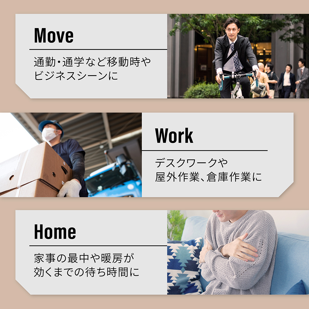 身体にピッタリ合ったサイズをお選びいただくことで、密着性が増して快適な暖かさを感じられます。さらにアウターなどで覆うと、より効果的に身体全体を温めることができます。