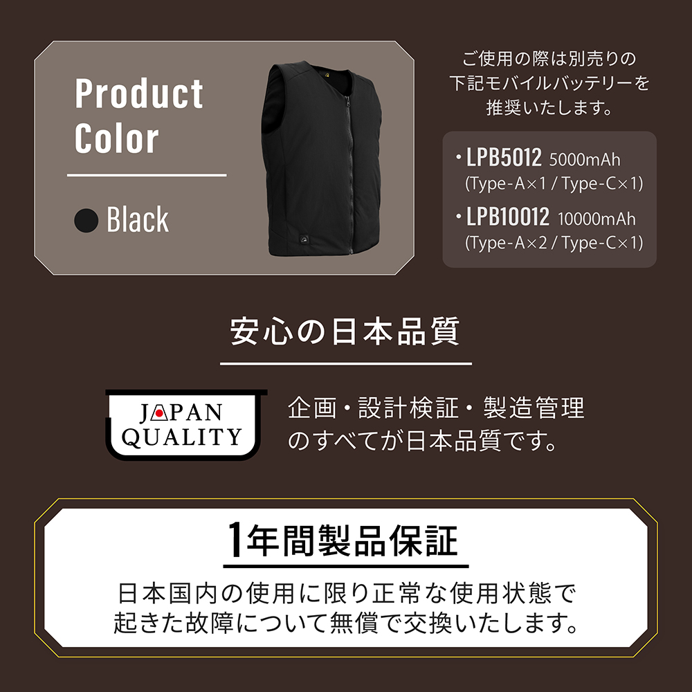 ※ケーブルはヒーティングベストに直接接続されており、取り外すことはできません。
