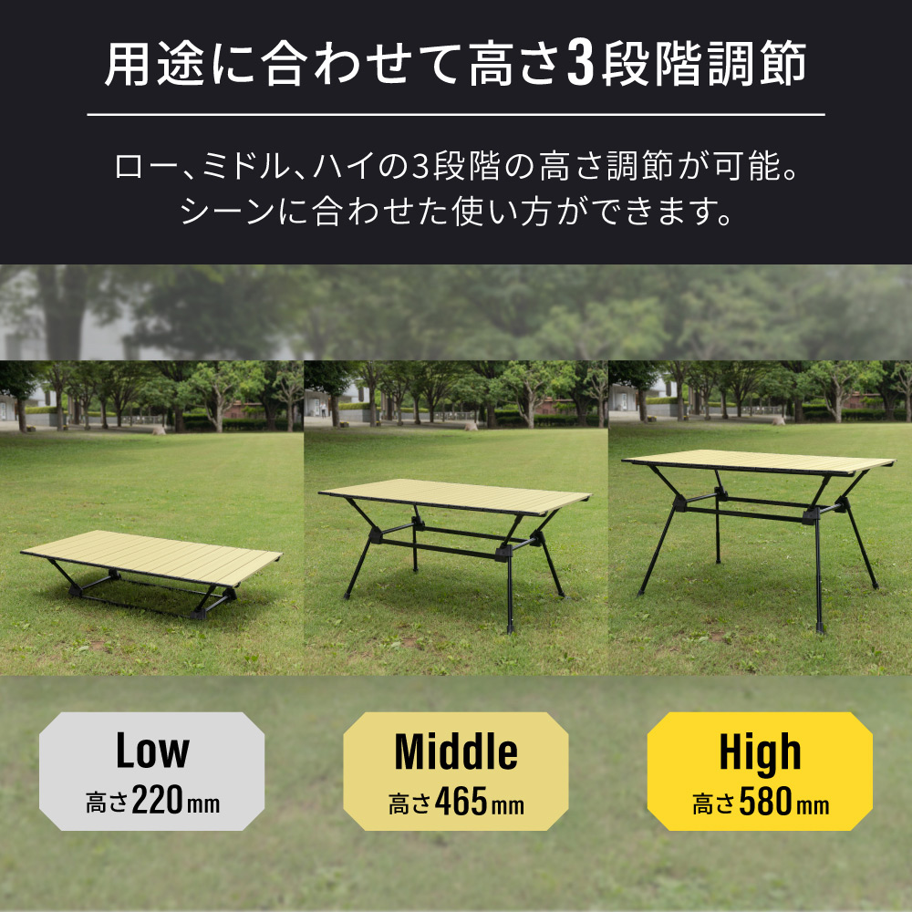 脚部ポールの組み方を工具不要で変えられるため、簡単にハイ・ミドル・ローの3スタイルでお使いいただけます。ロースタイルはデュオキャンプやお花見などのテーブルにぴったり。ミドルスタイルはローチェアに座って焚き火を囲むリラックスタイムに、ハイスタイルは立食形式の食事や調理のお供に。アイデア次第で何通りもの使い方ができます。