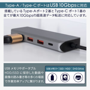搭載しているType-Aポート2基とType-Cポート1基の全てが最大10Gbpsの高速データ転送に対応しています。USBメモリやHDDはもちろん、ポータブルSSDに保存した動画や画像の読み込みなどでもスピーディーな作業が可能です。