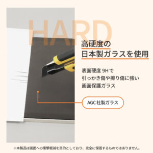 日本製の高硬度なガラスを採用。表面硬度9Hで引っかき傷や擦り傷に強いです。