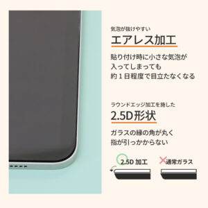 ガラスの縁にある角を丸めて指が引っかからないようにする、ラウンドエッジ加工を施した2.5D形状に仕上げています。ガラスの縁に指が引っかからず、快適な操作が可能です。