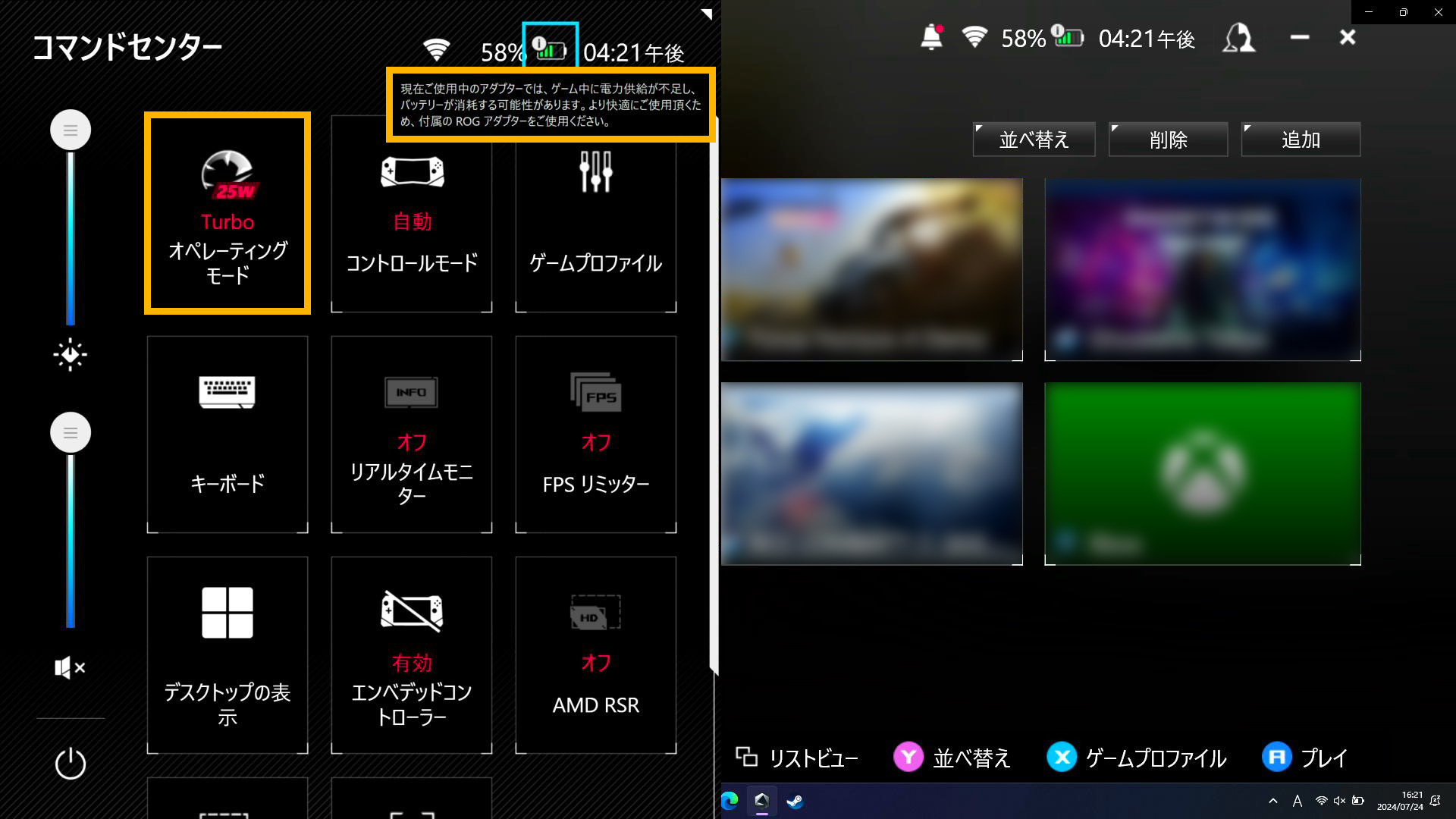 ROG Allyの画面に下記のような警告メッセージが表示されますが、正常に充電されており動作に大きな影響はありません。なお、ROG Ally(2023)付属のAC充電器をご使用の場合、オペレーティングモードは25W Turboまでの動作となります。